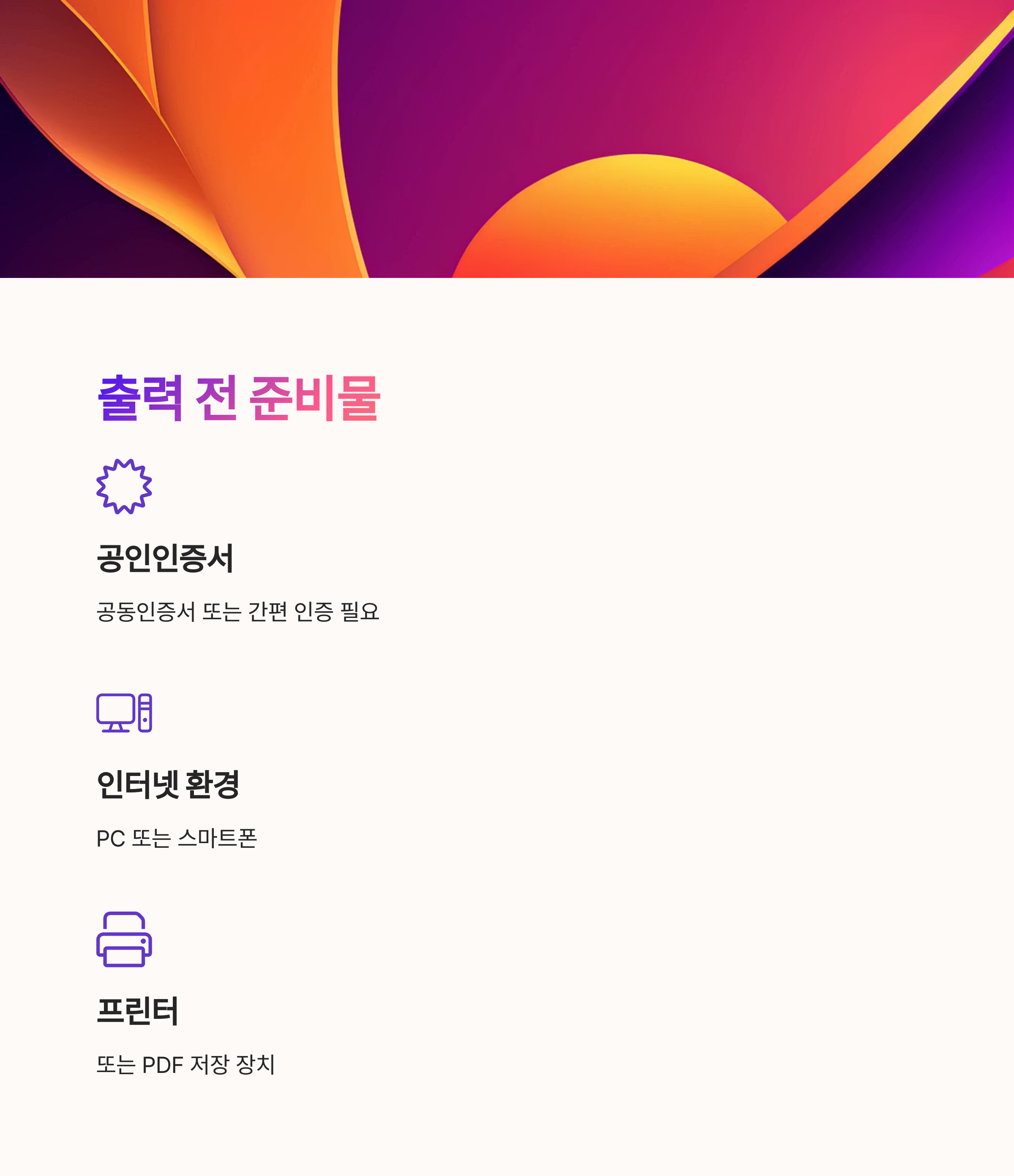 이제 준비물이 갖춰졌다면 인터넷으로 출력하는 방법을 알아봐야겠죠? 어렵지 않으니 아래 절차만 따라오면 누구나 쉽게 발급할 수 있어요. 💻