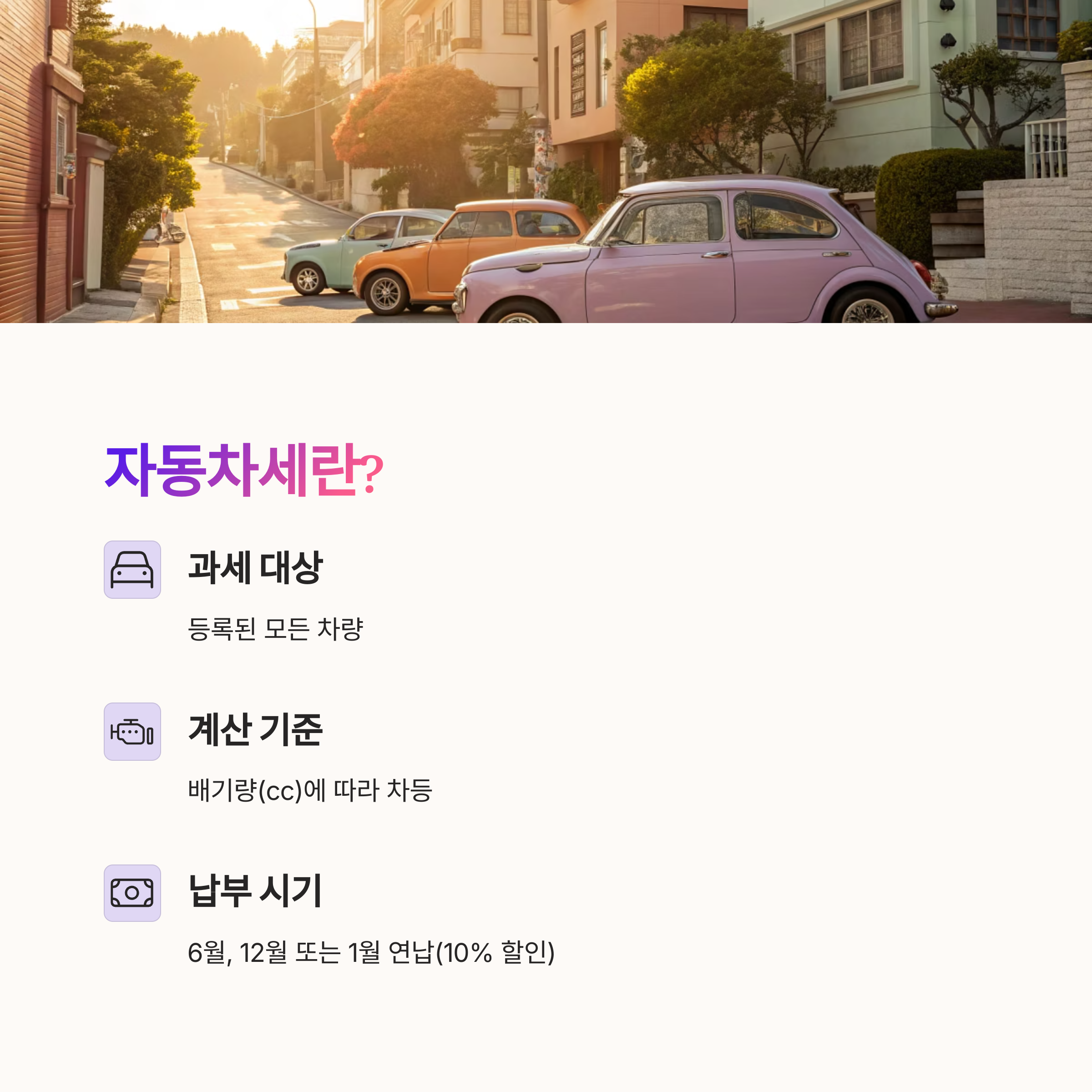 자동차세는 말 그대로 자동차를 소유한 사람에게 부과되는 세금이에요. 이 세금 역시 지방세 항목 중 하나이고, 자동차의 배기량 또는 전기차 여부에 따라 금액이 달라져요. 일반 내연기관차는 배기량이 크면 클수록 세금도 높아지죠.
