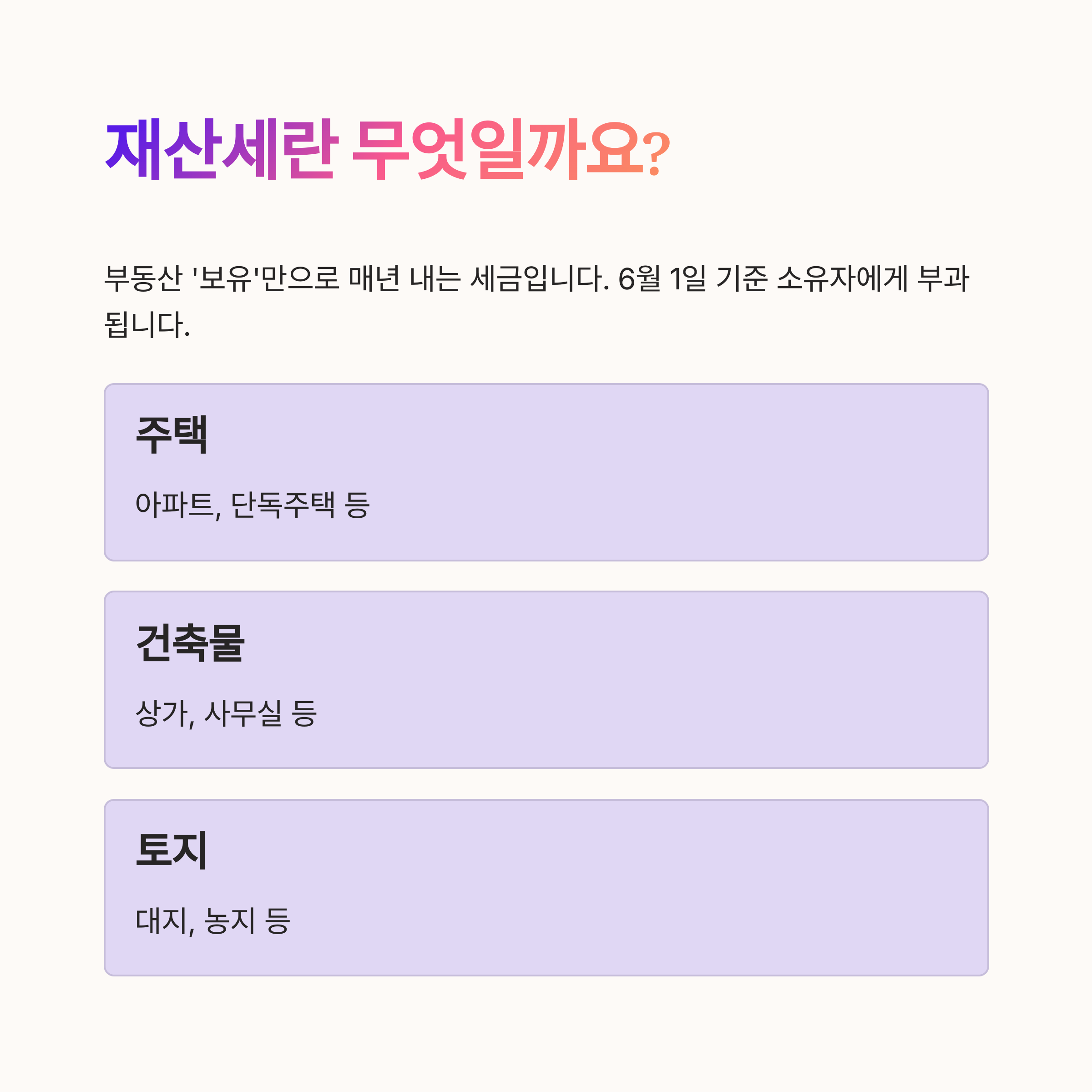 재산세는 지방자치단체가 부과하는 세금으로, 부동산을 소유하고 있는 사람에게 부과돼요. 정확하게는 주택, 건축물, 토지 등 소유 형태에 따라 다르게 책정되며, 매년 6월 1일을 기준으로 해당 재산을 보유한 사람이 납세의무자가 되죠.