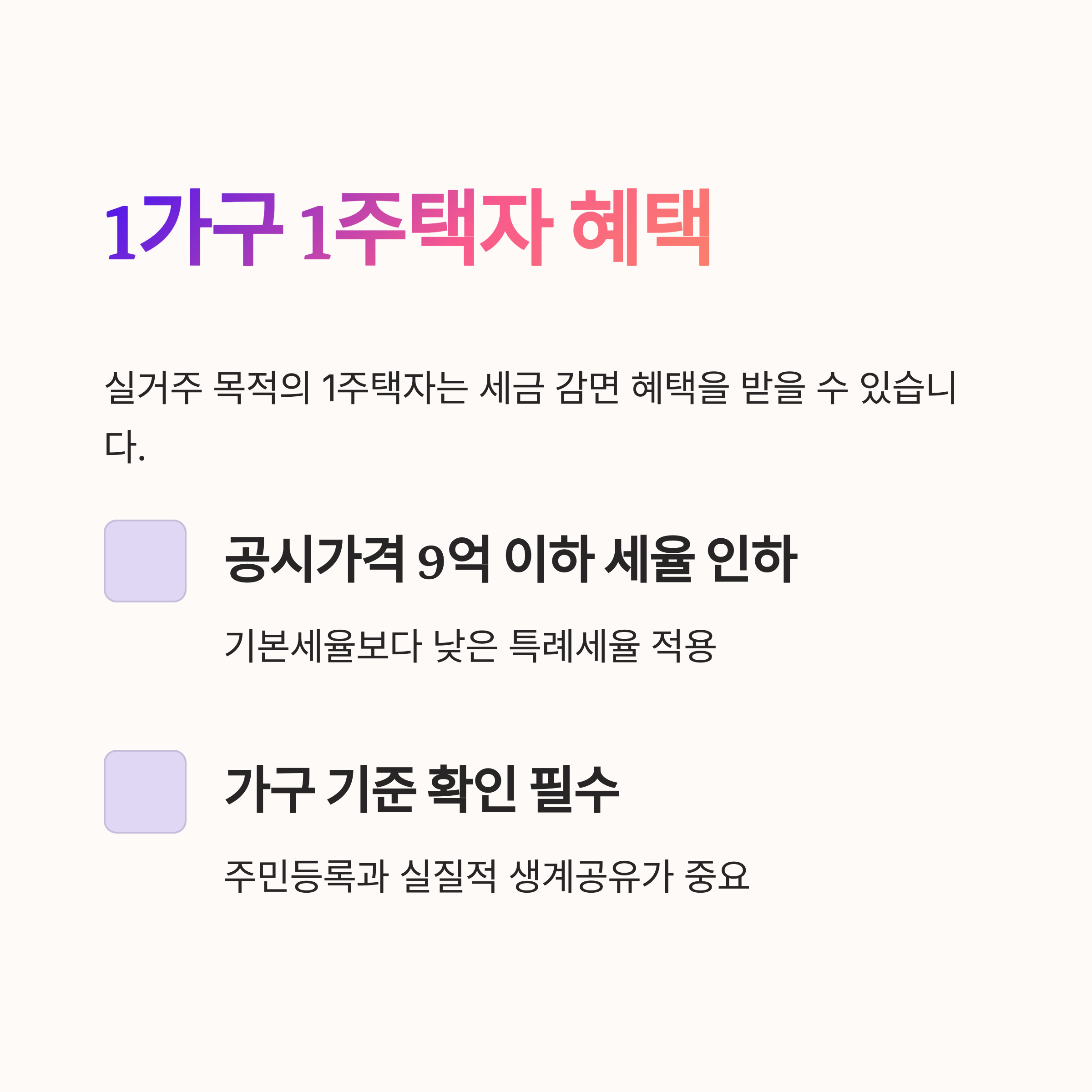 1가구 1주택은 절세 측면에서 매우 중요한 개념이에요. 정부는 주거 안정을 위해 실거주 목적의 1주택자에게 세금 감면 혜택을 주고 있거든요. 특히 공시가격 9억 원 이하의 경우 세율 자체가 낮아지고, 감면 혜택도 있어요.