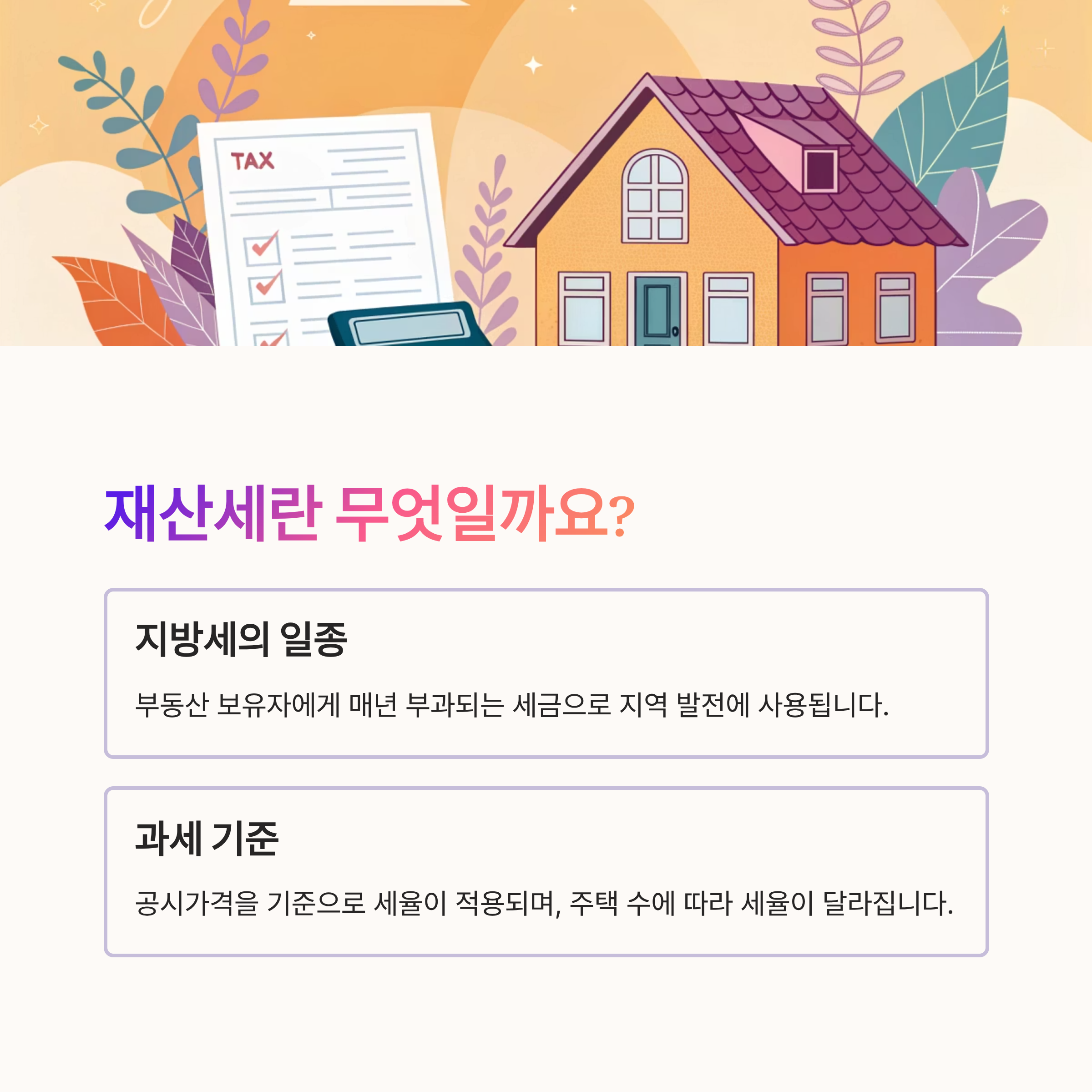 재산세는 부동산을 포함한 재산을 보유하고 있는 사람에게 부과되는 지방세예요. 쉽게 말해, 내가 가지고 있는 주택이나 건물의 가치를 기준으로 매년 부과되는 세금이죠. 이 세금은 내가 사는 지역의 지방자치단체로 들어가서 도로 정비나 지역 복지 같은 데 쓰인답니다.