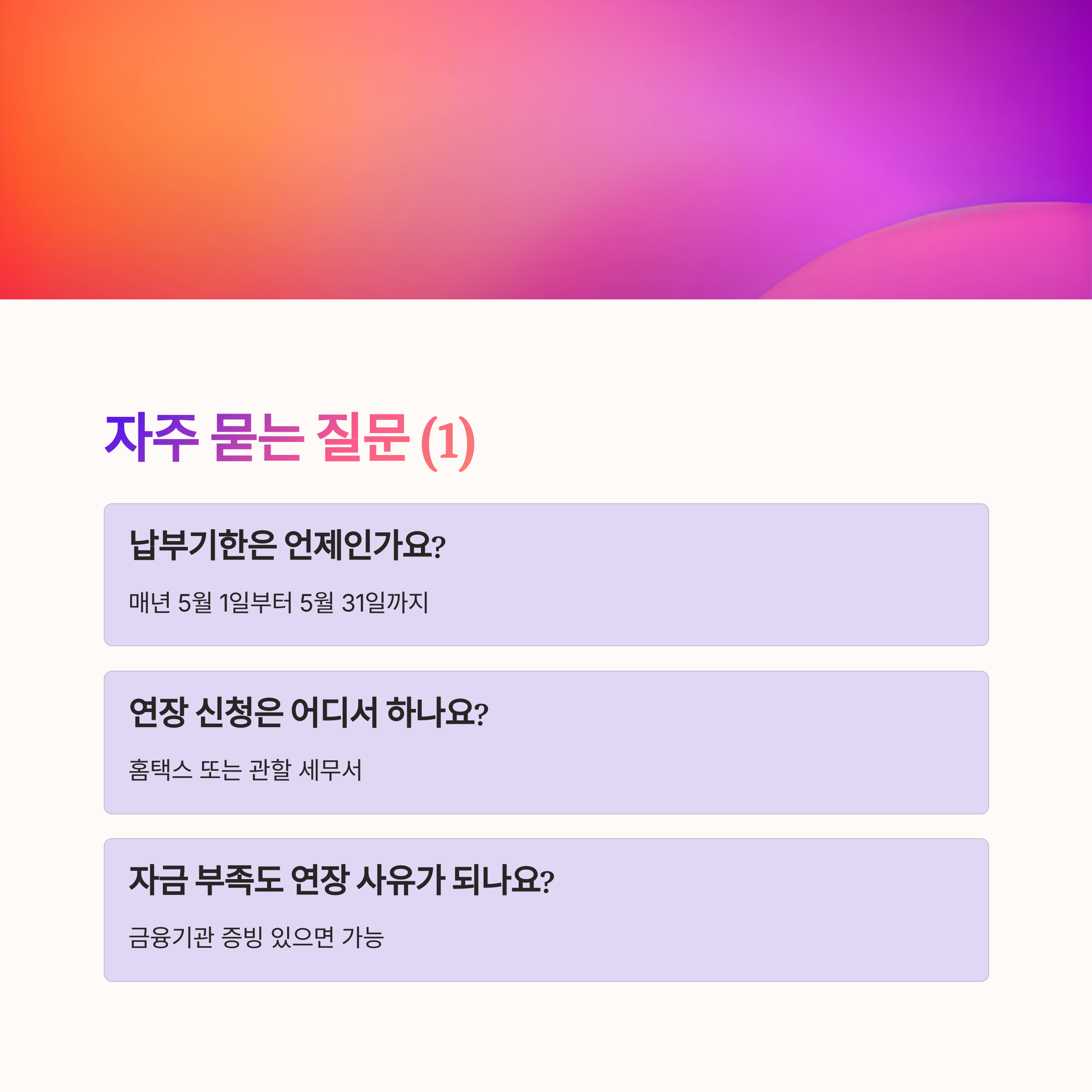 기한 연장이 아닌 '분할 납부'도 가능하니, 세액이 큰 경우에는 분납 제도를 함께 검토해 보는 것이 좋아요.