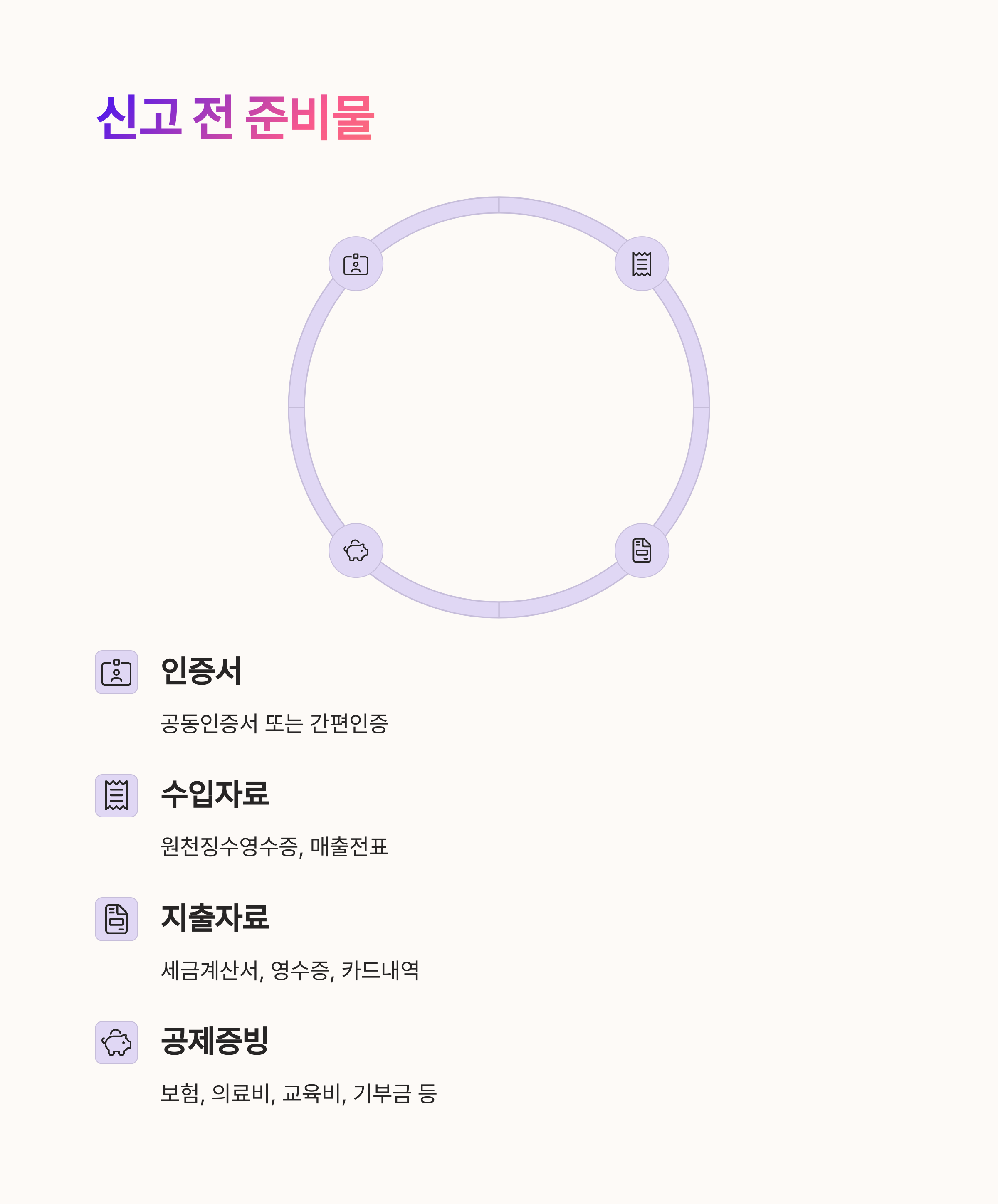 신고를 시작하기 전, 꼭 필요한 서류와 정보를 미리 준비해두면 훨씬 수월하게 진행할 수 있어요. 특히 홈택스를 통해 전자신고를 하려면 본인 인증 수단도 꼭 챙겨야 한답니다.