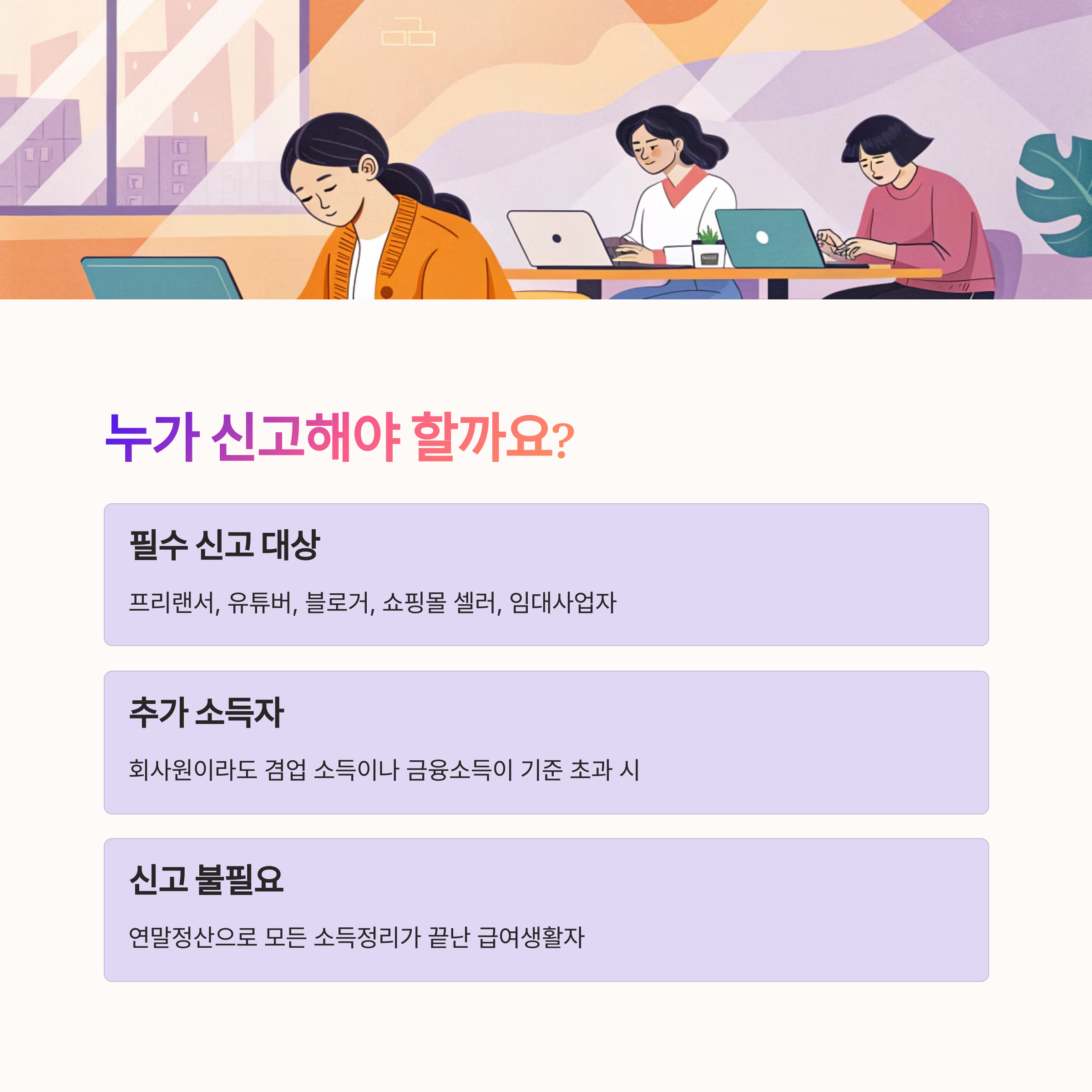 예를 들어, 프리랜서 강사, 유튜버, 블로그 운영자, 쇼핑몰 셀러, 임대사업자 등은 대표적인 신고 대상자예요. 그 외에도 공적연금 수령자, 고정 원고료를 받는 작가 등도 해당돼요.