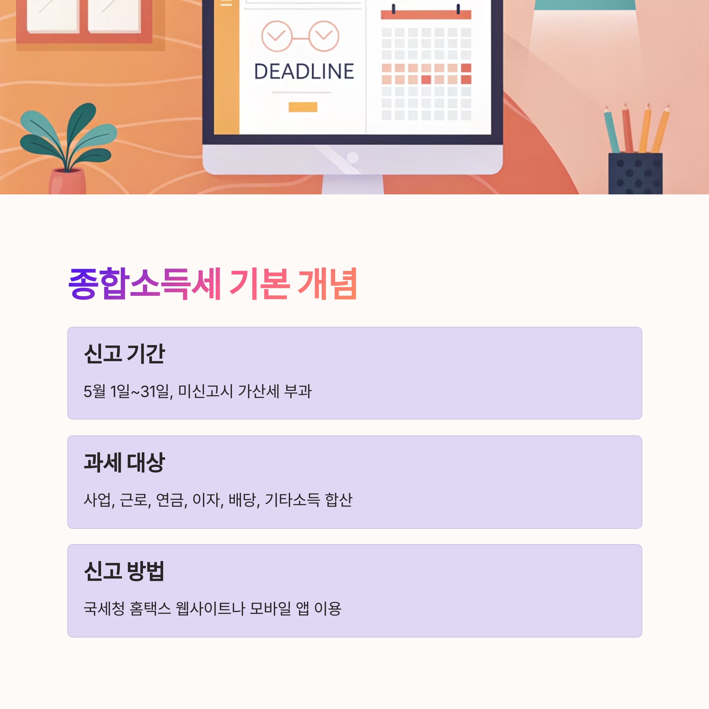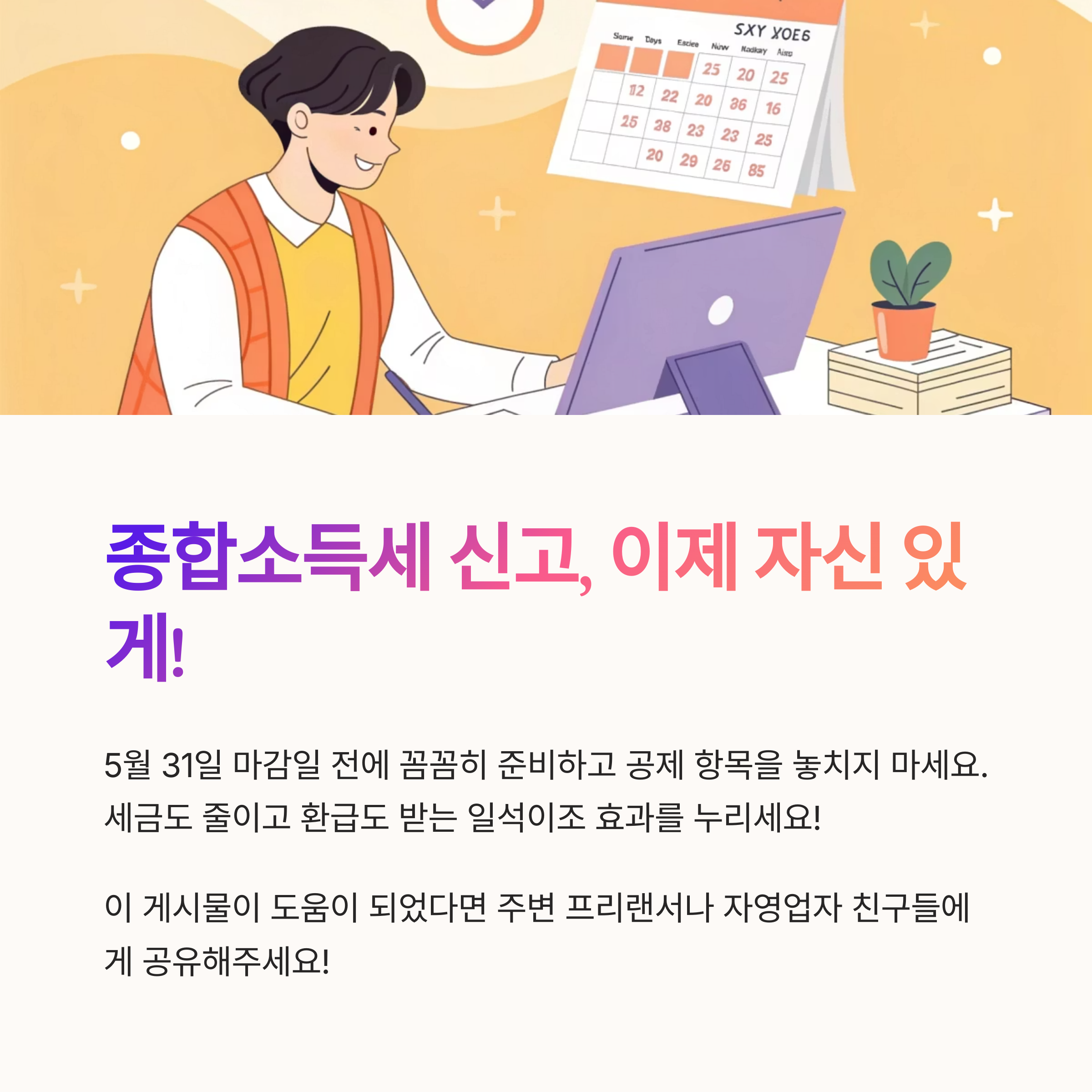 5월은 ‘종합소득세’ 신고의 달이에요! 매년 이맘때가 되면 ‘어디까지 공제받을 수 있을까?’, ‘혹시 빠뜨린 건 없을까?’ 고민이 많아지죠. 종합소득세는 1년 동안 얻은 다양한 소득을 합산해 세금을 계산하고 납부하는 절차인데요, 특히 프리랜서, 자영업자, 부동산 임대소득이 있는 분들이라면 절대 놓치면 안 되는 중요한 시기랍니다.