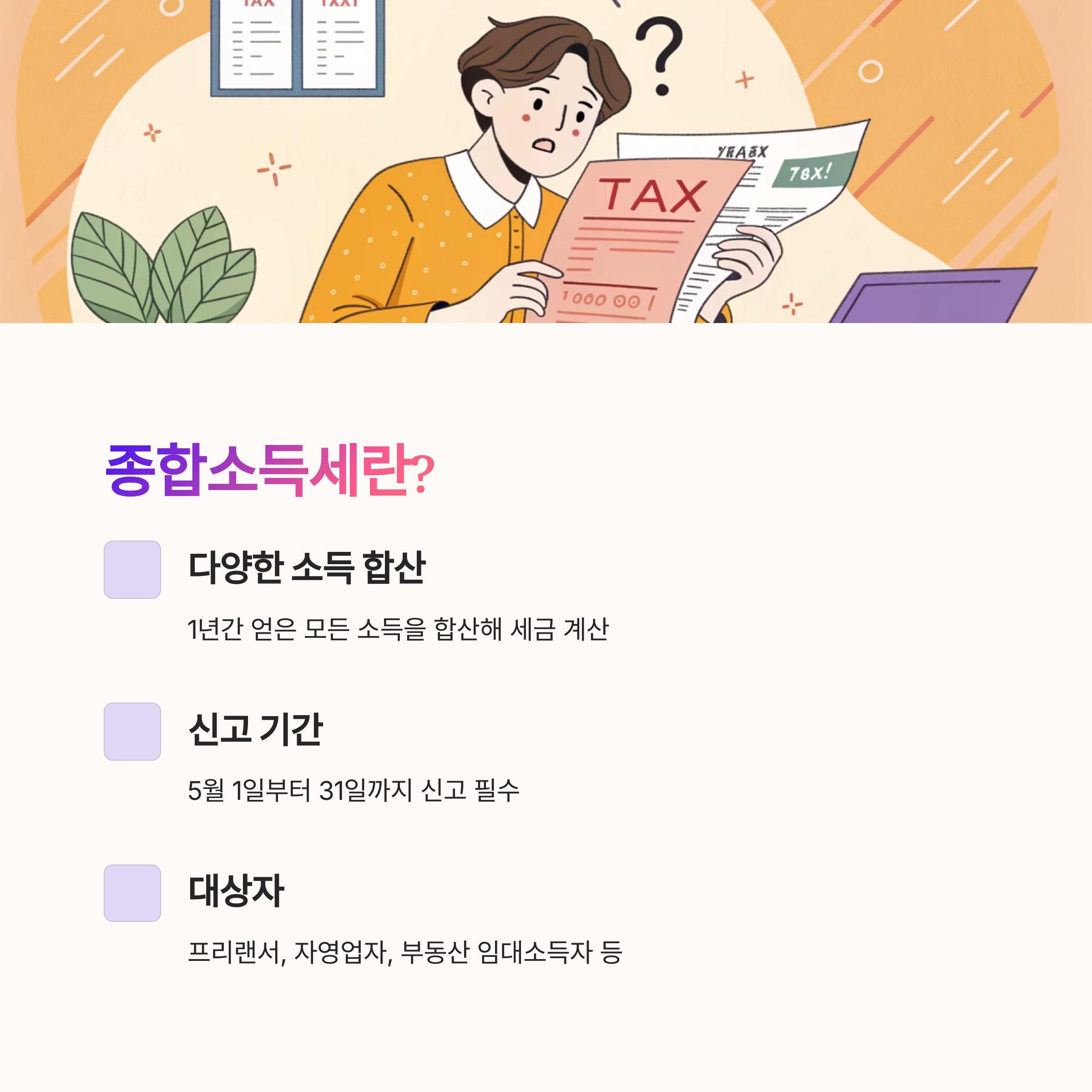 이처럼 종합소득세는 다양한 소득이 포함되기 때문에, ‘나는 그냥 회사 다니는 사람이니까 해당 없겠지?’라고 생각하면 안 돼요. 특히 부업으로 크몽, 탈잉, 스마트스토어 등으로 소득이 있다면 꼭 챙겨야 할 항목이랍니다! 😮