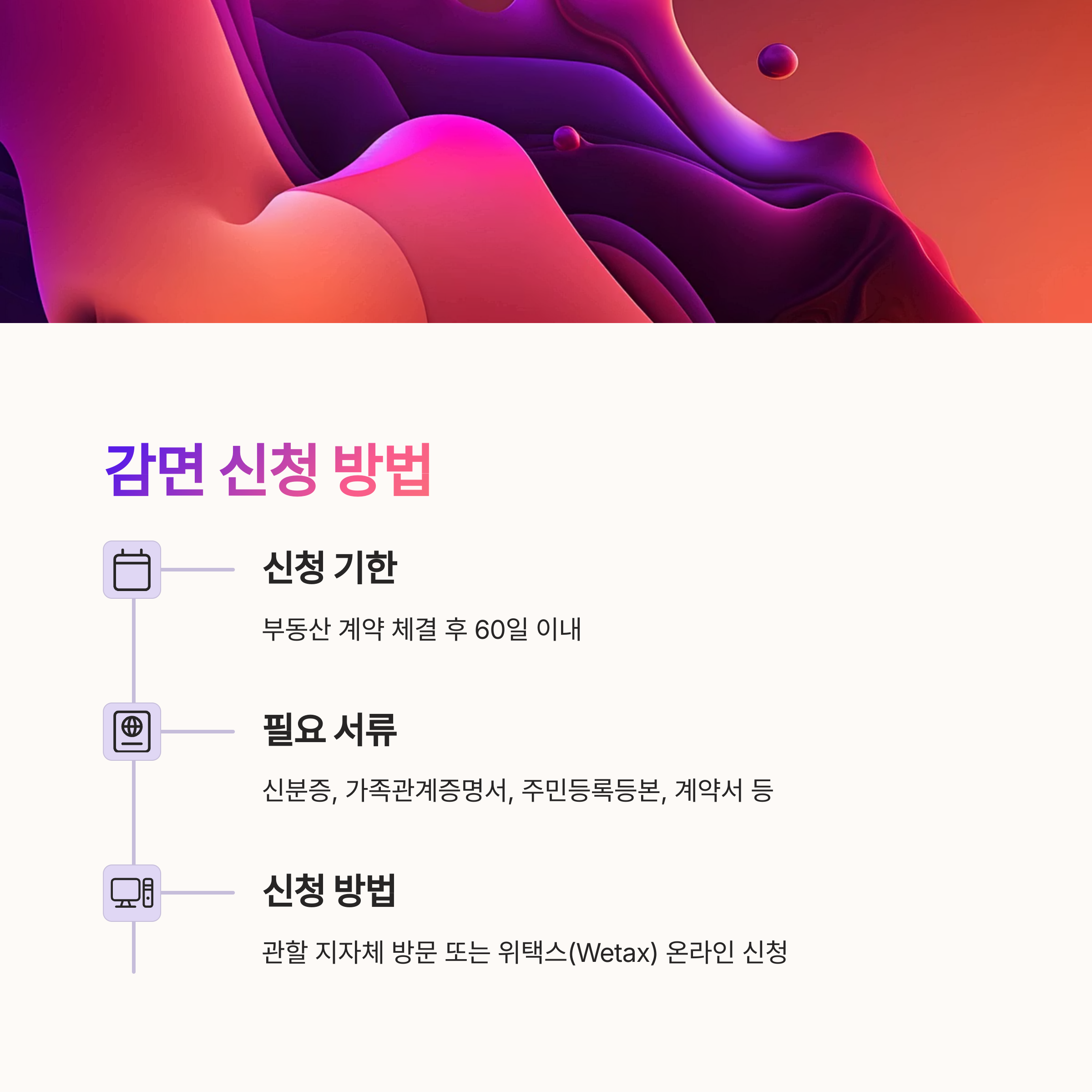 취득세 감면은 자동으로 적용되지 않아요. 반드시 본인이 관련 서류를 준비해 신청해야 해요. 신청을 하지 않으면 감면을 받을 수 없으니 주의하세요!