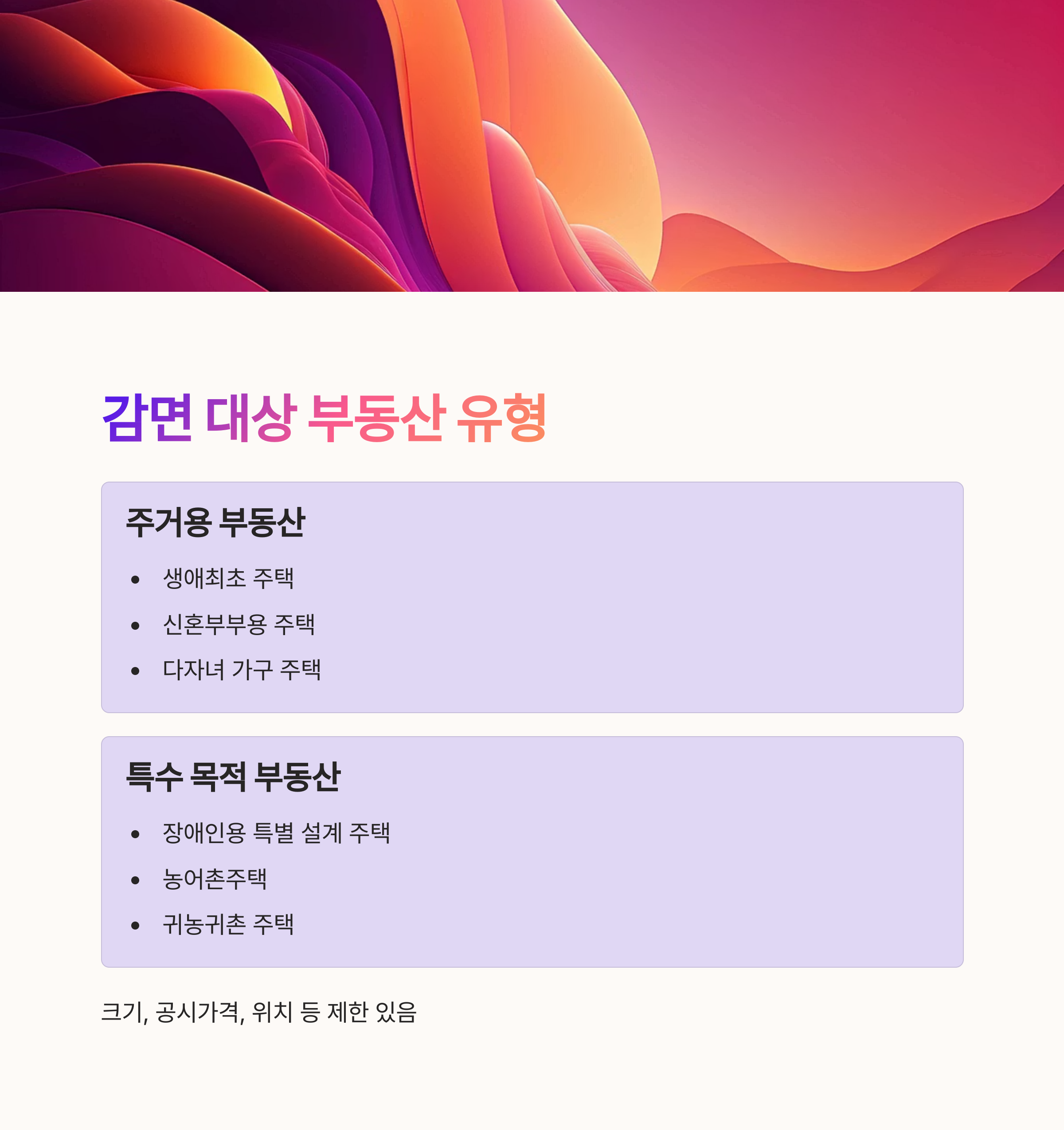 이 외에도 산업단지 입주 기업이나 일정한 목적의 상업용 부동산도 조건에 따라 감면을 받을 수 있어요. 하지만 대부분의 개인에게는 '주택' 관련 감면이 가장 중요하겠죠?