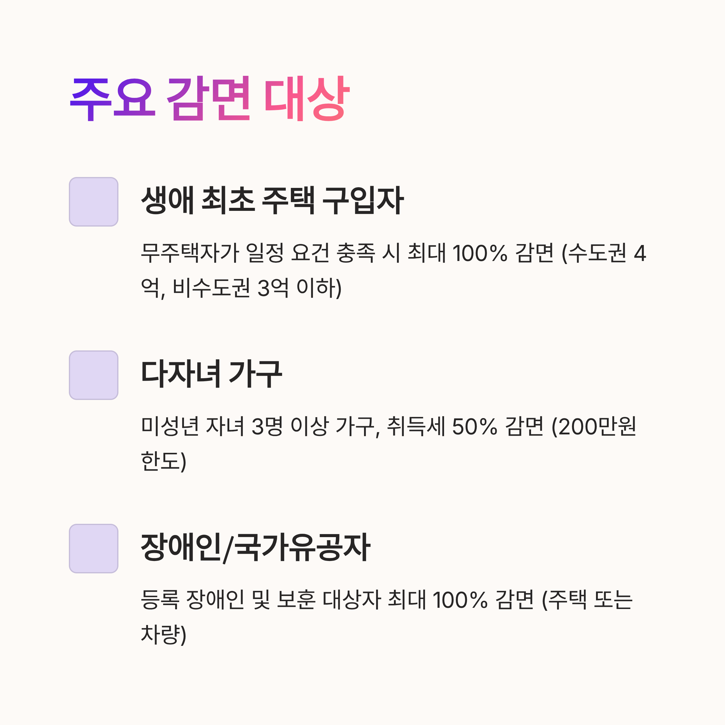 취득세 감면은 아무나 받을 수 있는 혜택이 아니에요. 정해진 요건을 갖춘 사람만 해당되고, 요건이 충족되지 않으면 감면이 거절될 수 있어요. 그래서 감면 대상과 요건을 미리 정확히 확인하는 것이 가장 중요해요.