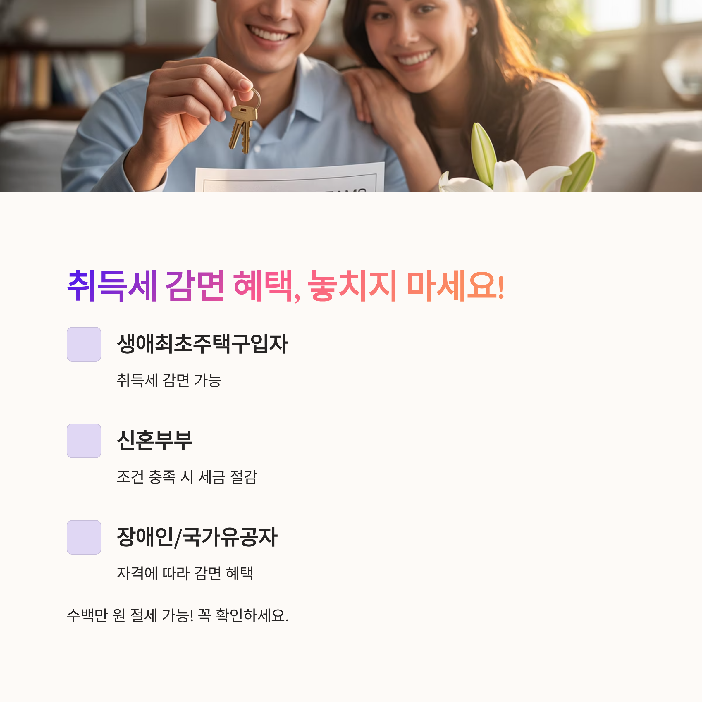 마지막으로는 ‘취득세 감면 혜택’이에요. 생애최초주택구입자, 신혼부부, 장애인, 국가유공자 등은 취득세 감면을 받을 수 있어요. 조건이 까다롭긴 하지만 요건만 맞으면 수백만 원 아낄 수 있으니 꼭 확인해봐야 해요.