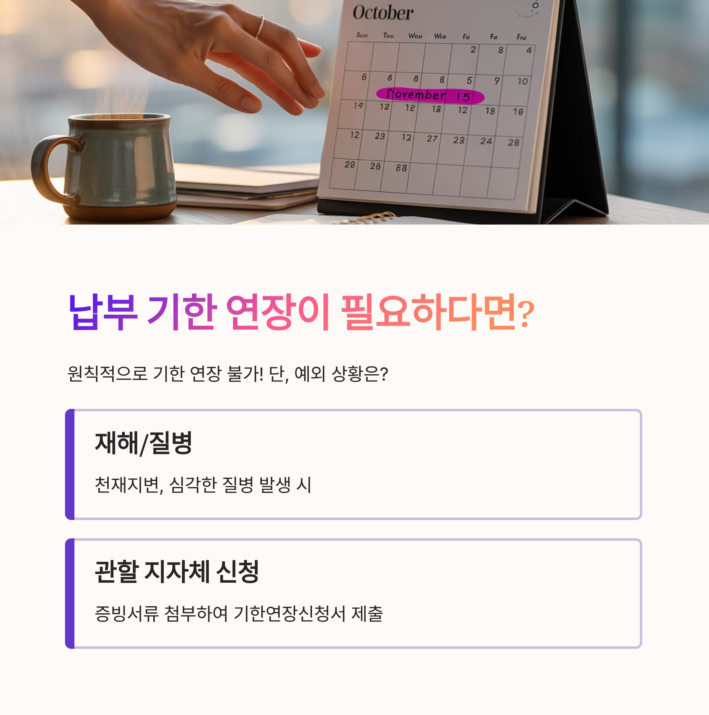 대부분의 경우에는 납부 기한 안에 처리하는 게 원칙이에요. 계획적으로 일정과 자금 흐름을 조율해두는 게 필요하죠. 갑작스러운 상황이 생기더라도 연장 사유에 해당하는지 먼저 확인해봐야 해요.