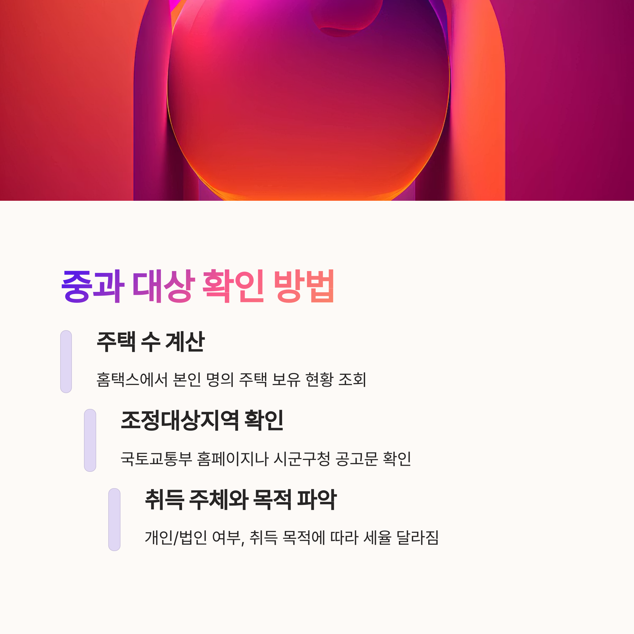 그럼 구체적으로 내가 중과 대상인지 어떻게 확인할 수 있을까요? 방법은 크게 3가지가 있어요. 첫째는 '주택 수 계산'을 정확히 하는 것. 둘째는 ‘조정대상지역 여부’를 파악하는 것. 셋째는 ‘취득 주체와 목적’을 명확히 하는 거예요.