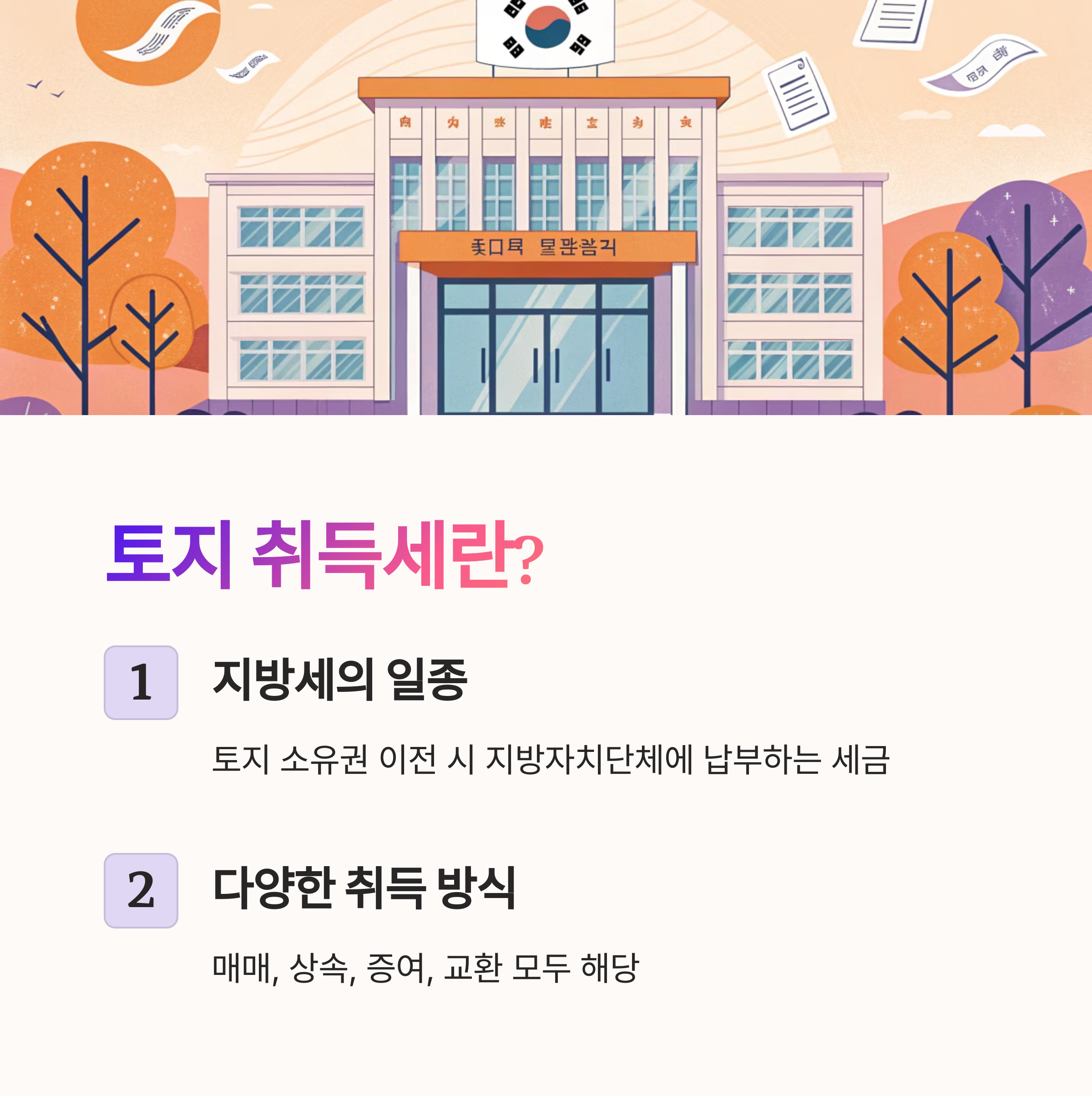 토지 취득세는 지방세 중 하나로, 일정 기준 이상의 부동산이나 토지를 취득할 때 부과돼요. ‘취득’이라는 말에는 단순 매매뿐만 아니라 상속, 증여, 교환, 무상양도도 포함돼요. 즉, 소유권이 이전되는 거의 모든 상황에서 이 세금이 등장한다고 보면 돼요.