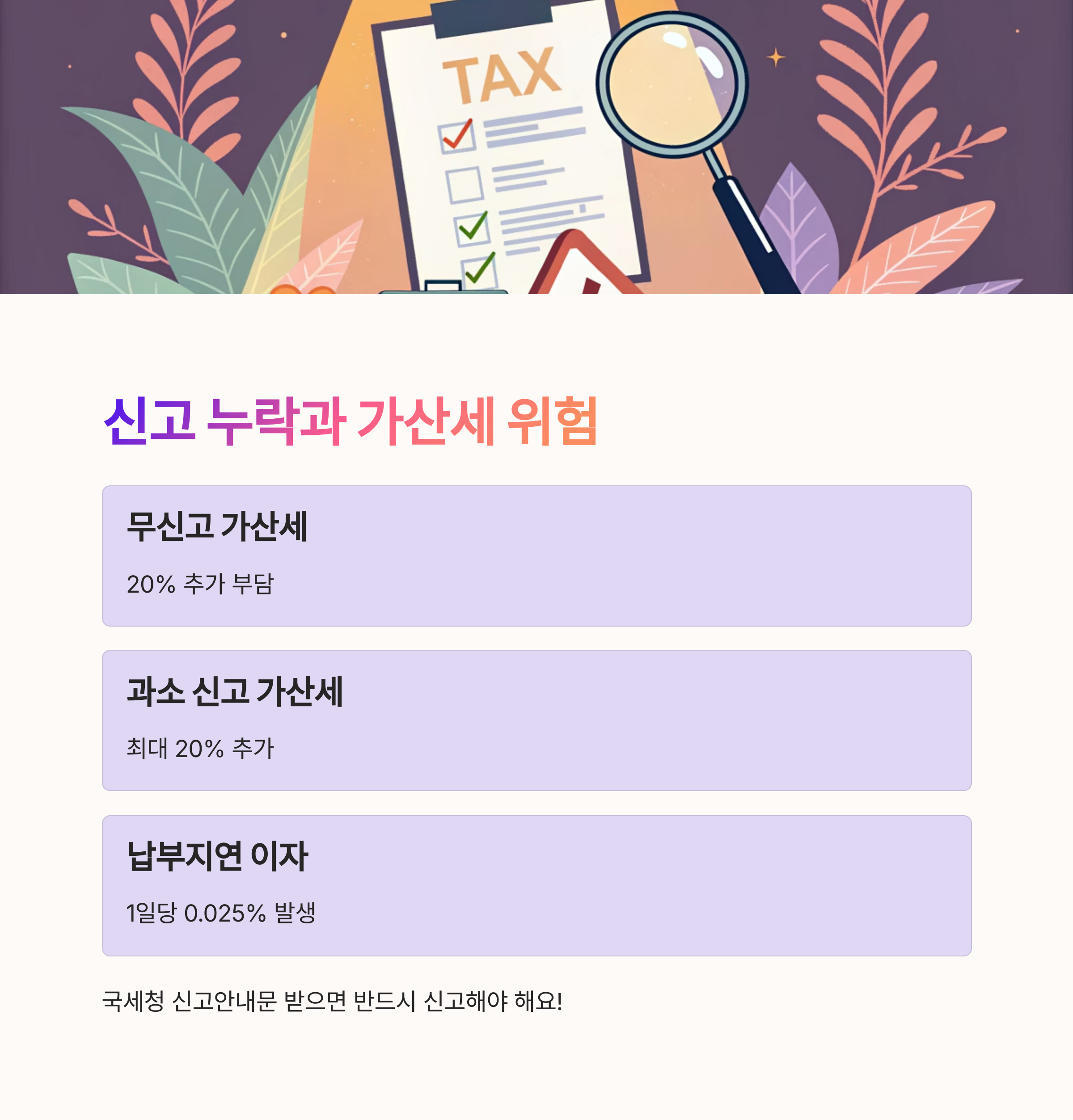 가산세에는 3가지 종류가 있어요. 1) 무신고 가산세 20%, 2) 과소 신고 가산세 최대 20%, 3) 납부지연에 따른 이자 1일당 0.025%로 붙어요. 예를 들어 100만 원을 신고하지 않으면, 20만 원 이상의 벌금이 추가될 수 있어요. 😨