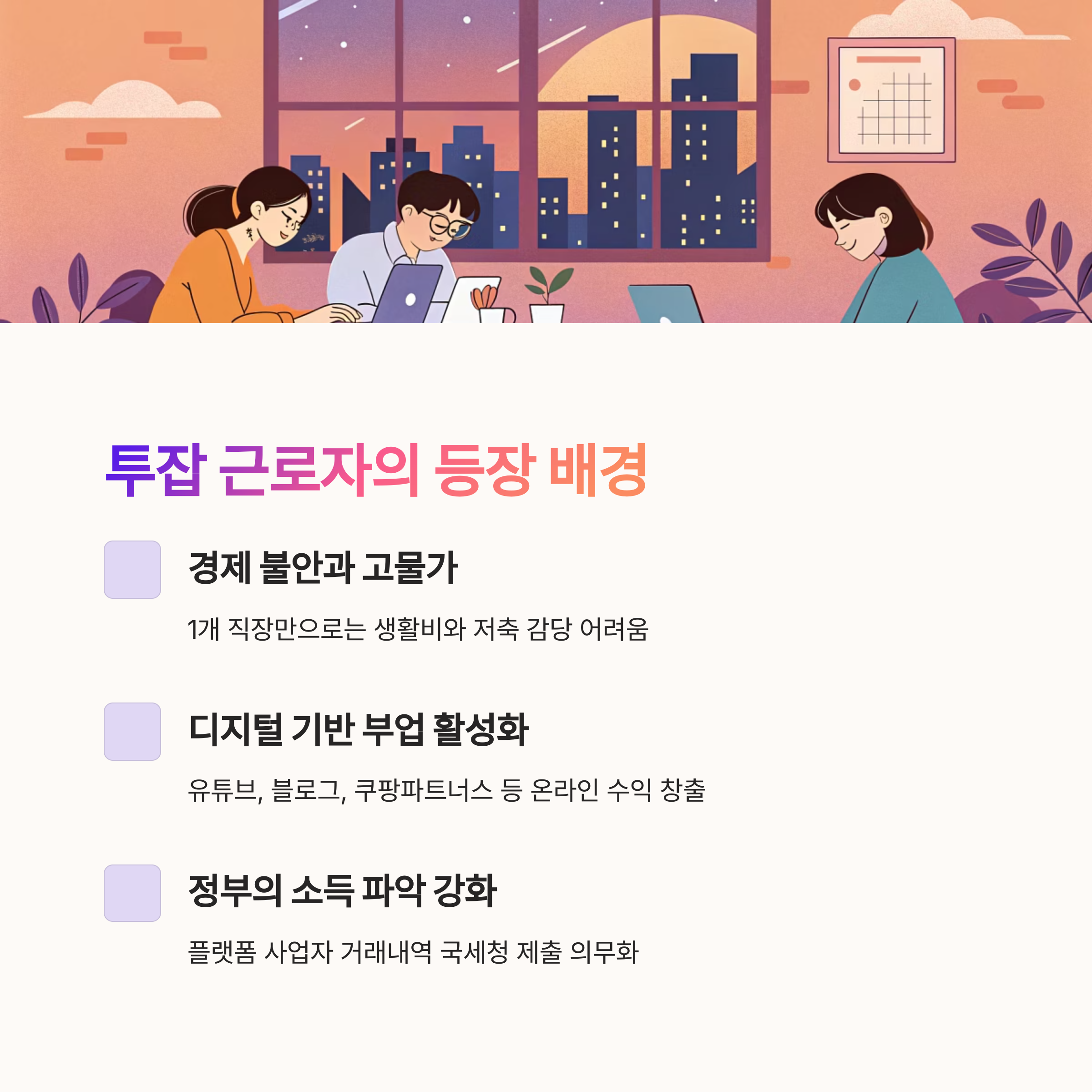 최근 몇 년 사이 ‘N잡러’, ‘투잡러’라는 용어가 익숙해질 만큼 부업을 병행하는 사람들이 급증했어요. 경제 불안, 고물가 시대, 1개의 직장만으로는 생활비와 저축을 감당하기 어렵다는 현실이 투잡의 동기가 되었답니다. 특히 2030 세대는 낮에는 회사원, 밤에는 콘텐츠 제작자, 온라인 쇼핑몰 운영자 등 다양한 형태로 투잡에 뛰어들고 있어요.