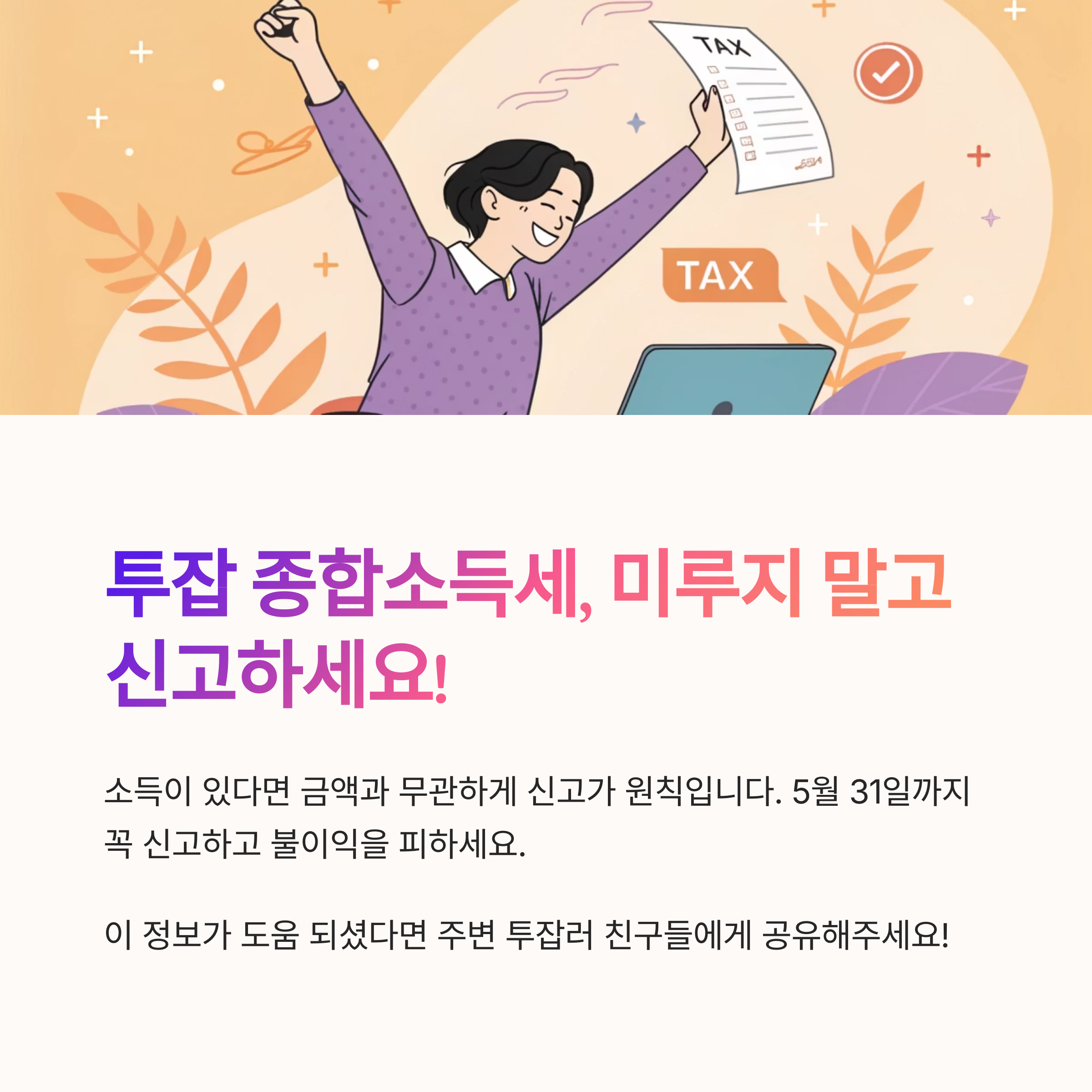 잘못 신고하거나 누락될 경우 가산세가 붙을 수 있고, 세무조사 대상으로 지정될 수 있어요. '나는 회사 다니는데 뭘 신고해?'라고 생각하는 순간 실수할 수 있어요. 본업 외 수입이 조금이라도 있다면 꼭 확인하고 신고해야 해요!