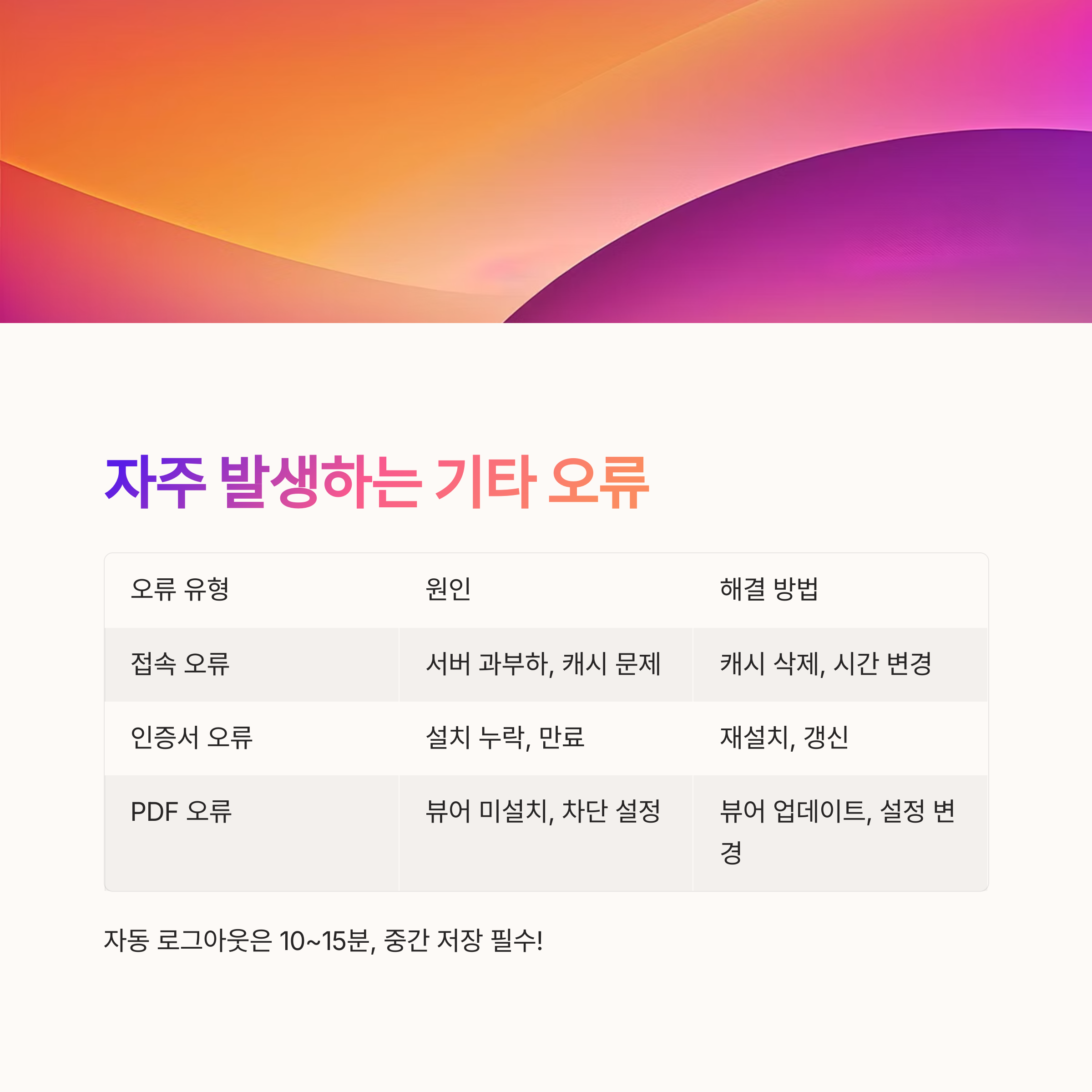| PDF 오류 | 뷰어 미설치, 차단 설정 | 뷰어 업데이트, 설정 변경 |