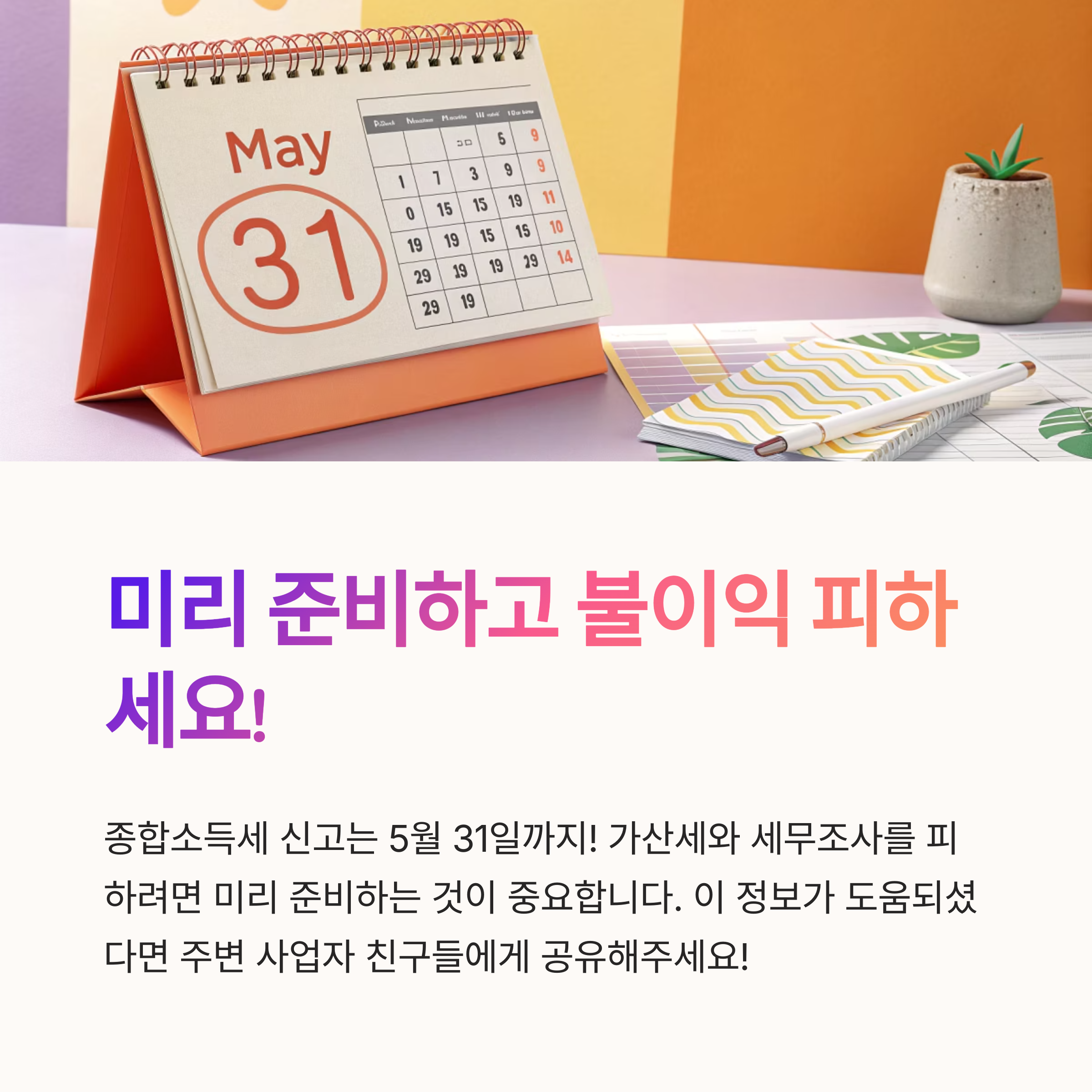 가산세 체계는 세금에 대한 경각심을 주는 동시에, 조금이라도 빨리 조치하도록 유도하는 것 같아요. 잊기 쉬운 5월이지만 그만큼 중요한 달이라는 사실을 기억해두는 게 좋아요.