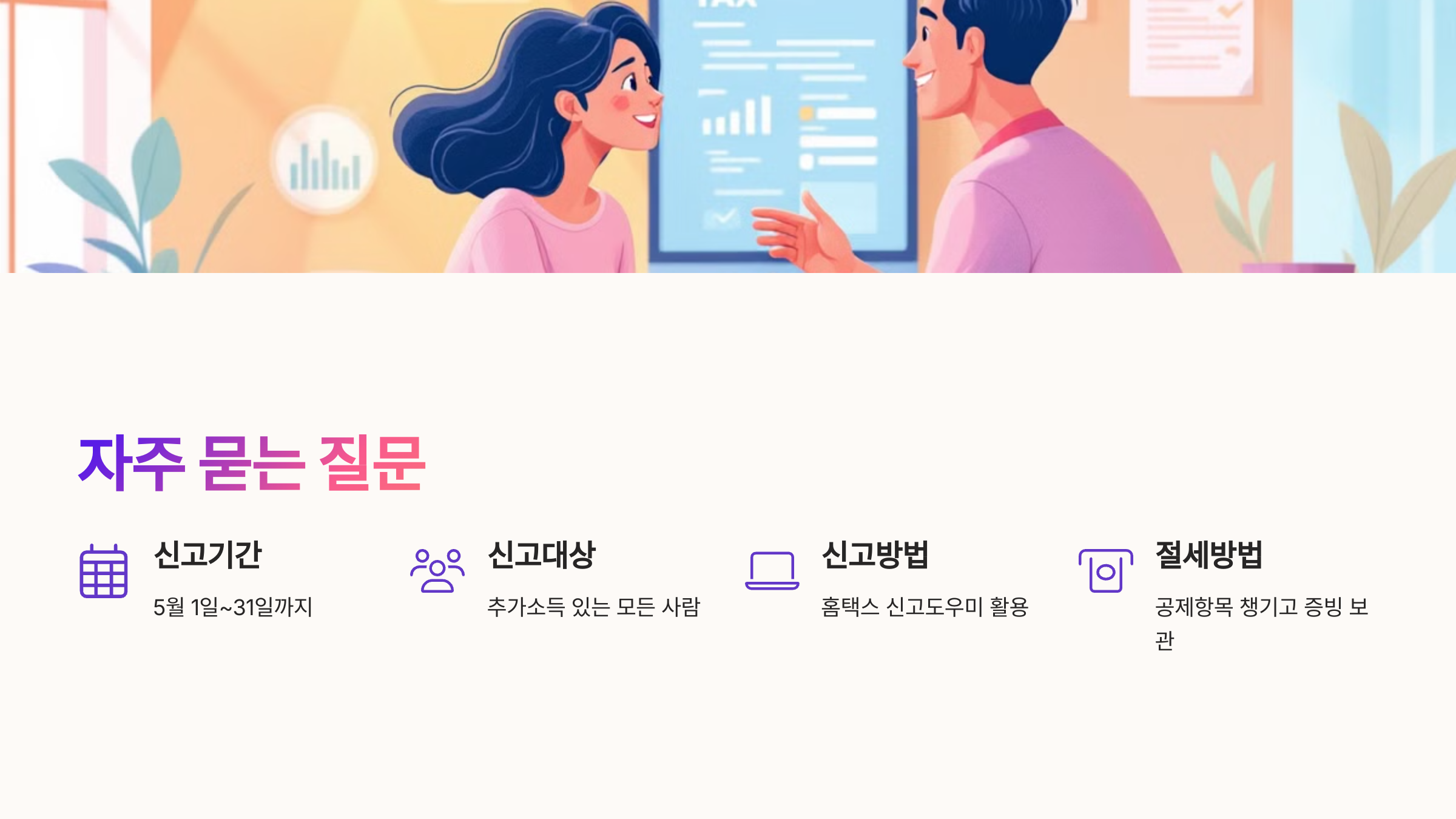 A8. 처음 신고하거나 복잡한 소득 구조를 가진 분들은 세무사와 상담하는 게 좋아요. 실수 없이, 절세도 가능하니까요!