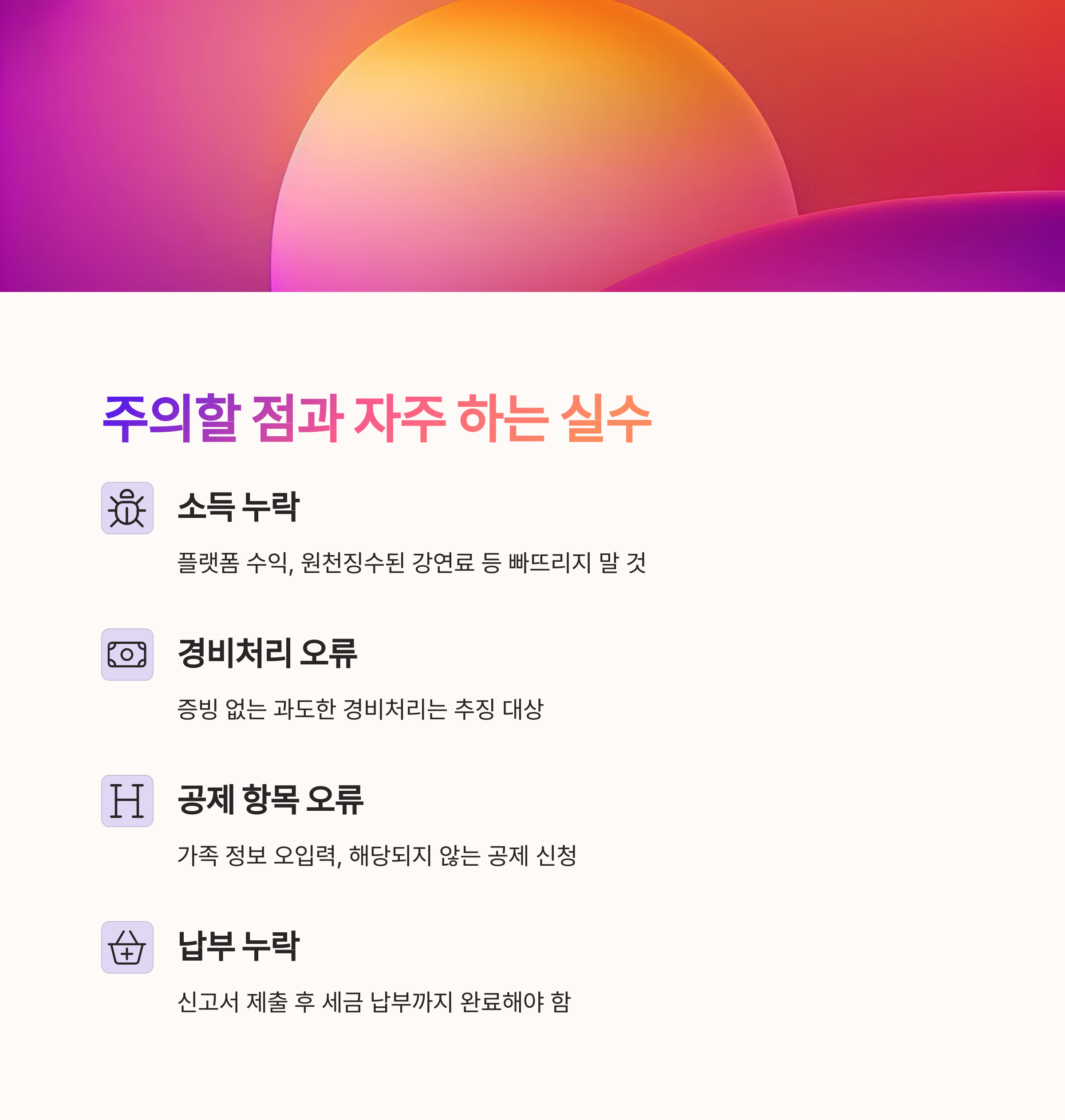 종합소득세 신고에서 가장 흔한 실수는 '빠뜨린 소득'이에요. 예를 들어, 플랫폼에서 받은 수익이나 원천징수된 강연료 등을 누락하는 경우가 종종 있어요.