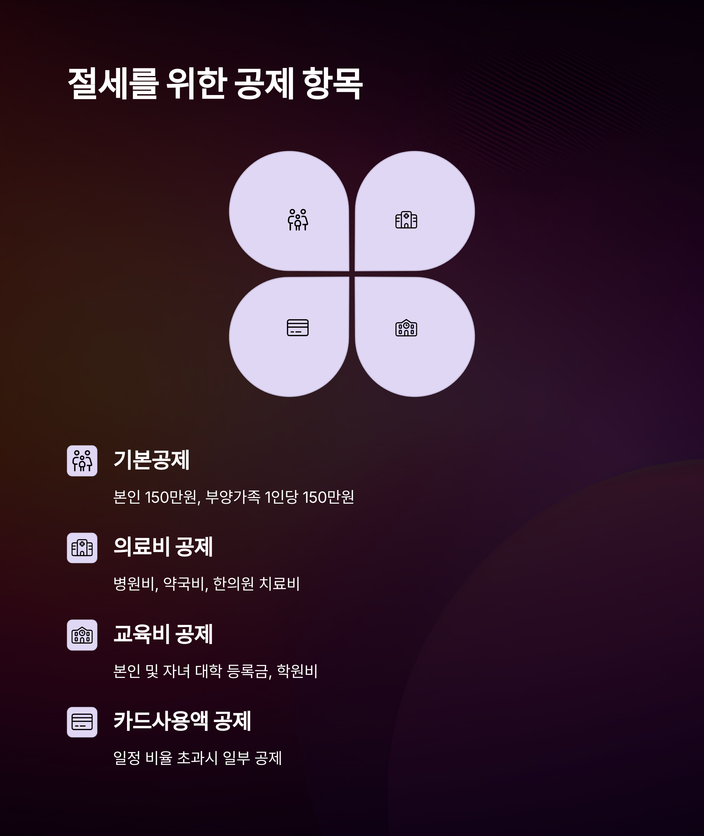 1. 기본공제: 본인 150만원, 부양가족(배우자, 자녀, 부모 등) 1인당 150만원