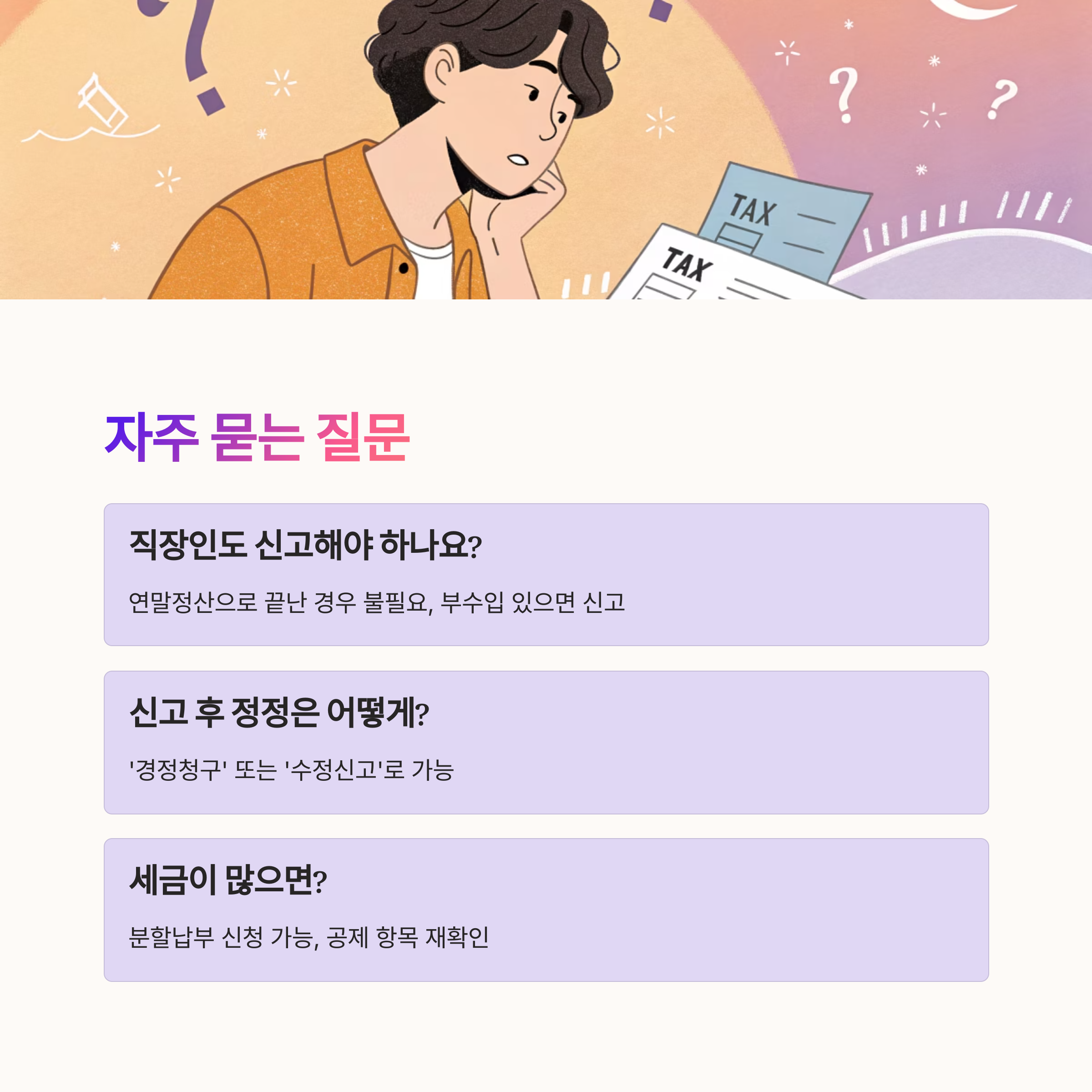 A2. 연말정산으로 끝난 경우는 별도로 신고할 필요 없지만, 부수입이 있는 경우엔 추가 신고해야 해요.